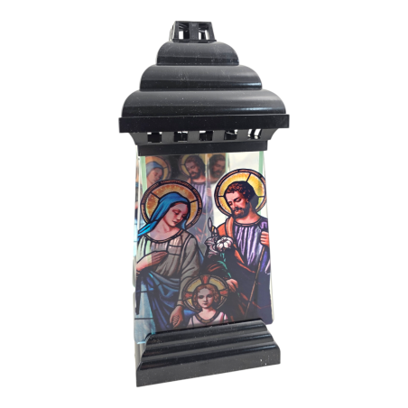 Znicz szklany w kształcie kapliczki ze Świętą Rodziną.