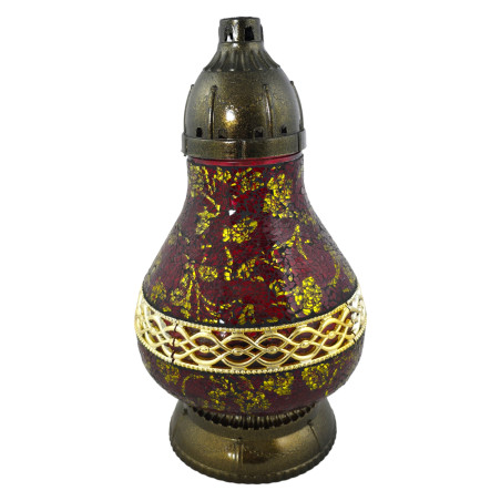 Lampion szklany ozdobiony w stylu mozaikowym. Czapka i podstawka zrobione są z plastiku. Nie zawiera wkładu.