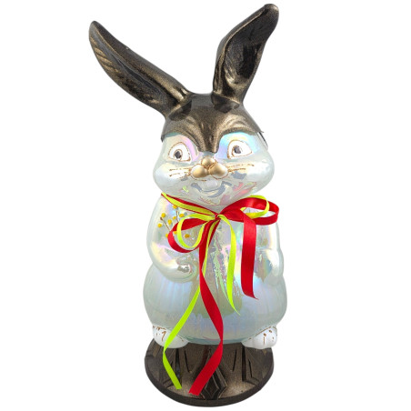 Znicz szklany w kształcie zająca. Wstążka w różnych kolorach wysyłanych losowo. Zawiera wkład wymienny.
