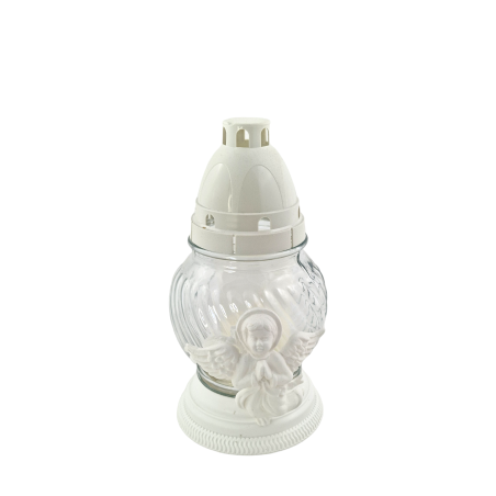 Znicz szklany w kształcie kulki z plastikową aplikacją w formie aniołka. Zawiera wkład wymienny.