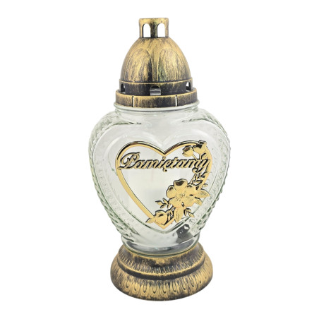 Duży, szklany znicz w kształcie serca ze złotą aplikacją. Zawiera wkład wymienny.