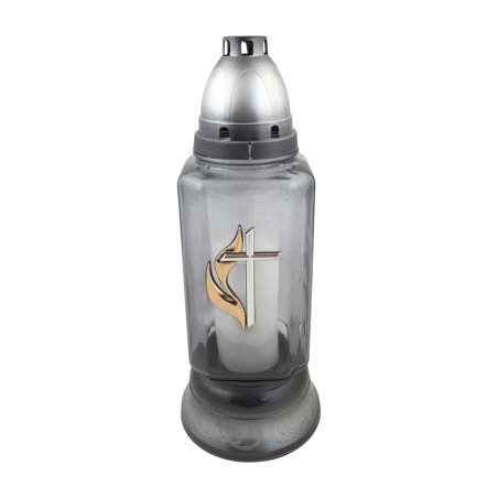 Szklany, kwadratowy znicz z grafitową poświatą oraz złoto srebrną aplikacją krzyża i płomienia. Produkt zawiera wymienny wkład parafinowy.