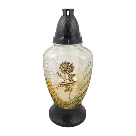 Szklany znicz zdobiony drobnym piaskiem oraz ze złotą aplikacją róży. Produkt zawiera wymienny wkład parafinowy.