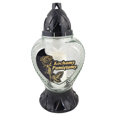 Duży znicz w kształcie serca ze złoto czarną aplikacją róży oraz z napisem KOCHAMY PAMIĘTAMY. Produkt zawiera wymienny wkład parafinowy.
