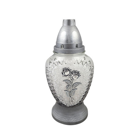 Znicz ze srebrną aplikacją róży na tle ze szklanej posypki. Produkt zawiera wymienny wkład parafinowy.