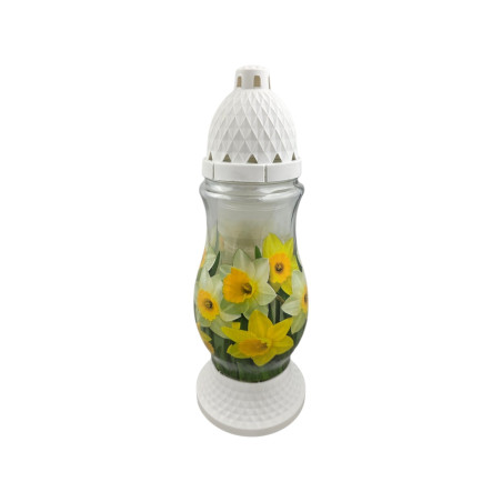 Znicz szklany, opięty folią z wiosennym wzorem. Pokrywka i podstawka z robione są z plastiku. Zawiera wkład wymienny.