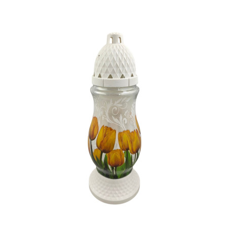 Znicz szklany, opięty folią z wiosennym wzorem. Pokrywka i podstawka z robione są z plastiku. Zawiera wkład wymienny.