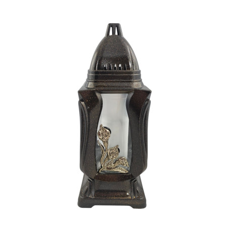Znicz szklany w plastikowej obudowie z wkładem parafinowym i aplikacją w formie kalii. Pokrywka i podstawka zrobione są z plastiku.